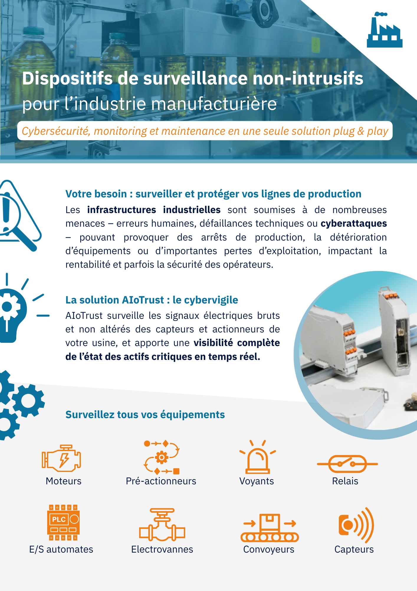 La solution AIoTrust s’installe sans intrusion, en quelques minutes, et vous permet de surveiller, de détecter et d’alerter en temps réel, indépendamment du SCADA ou des automates, en cas de sabotages ou défaillances techniques.